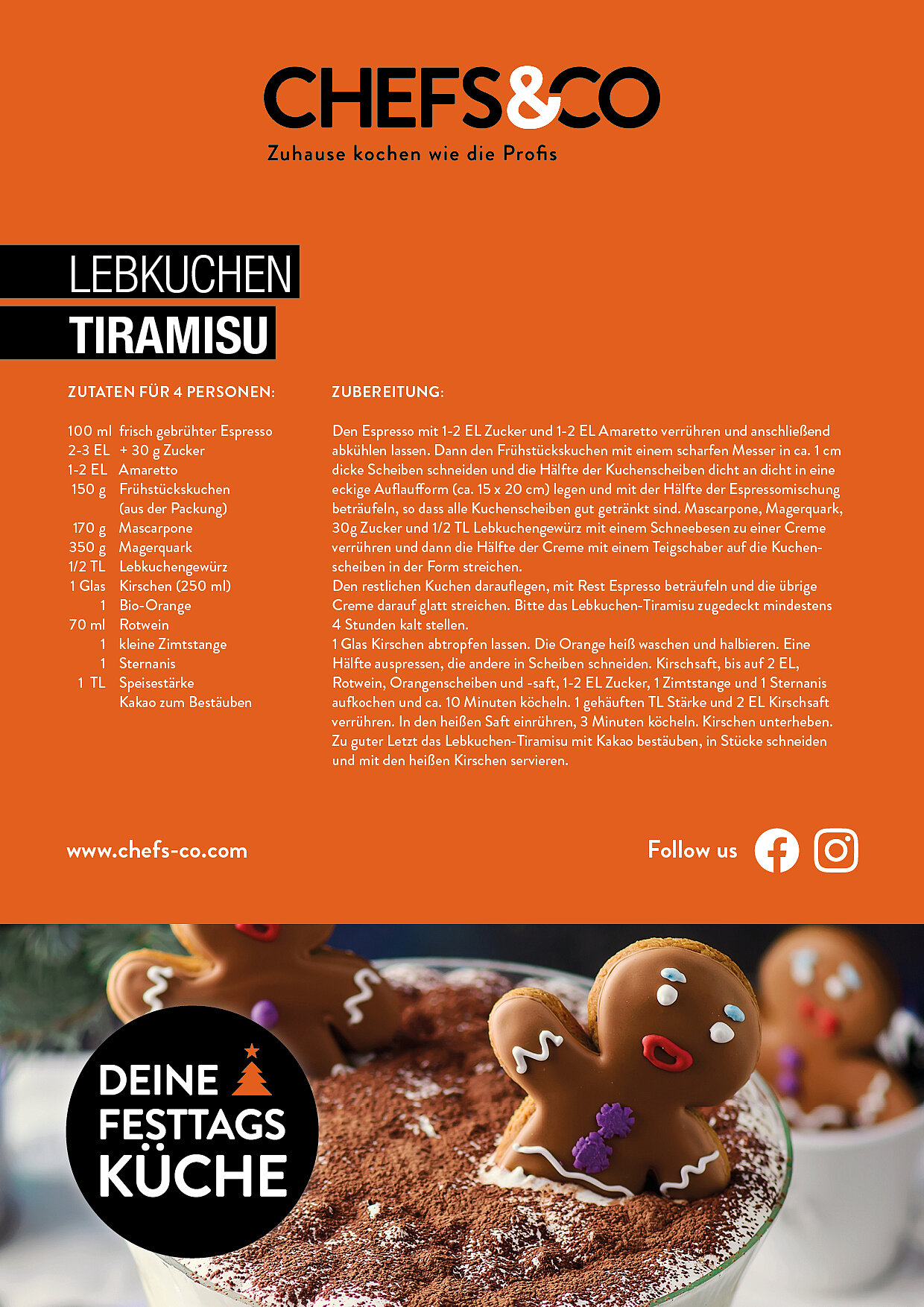 1 Glas Kirschen abtropfen lassen. Die Orange heiß waschen und halbieren. Eine Hälfte auspressen, die andere in Scheiben schneiden. Kirschsaft, bis auf 2 EL, Rotwein, Orangenscheiben und -saft, 1-2 EL Zucker, 1 Zimtstange und 1 Sternanis aufkochen und ca. 10 Minuten köcheln. 1 gehäuften TL Stärke und 2 EL Kirschsaft verrühren. In den heißen Saft einrühren, 3 Minuten köcheln. Kirschen unterheben. Zu guter Letzt das Lebkuchen-Tiramisu mit Kakao bestäuben, in Stücke schneiden und mit den heißen Kirschen servieren.