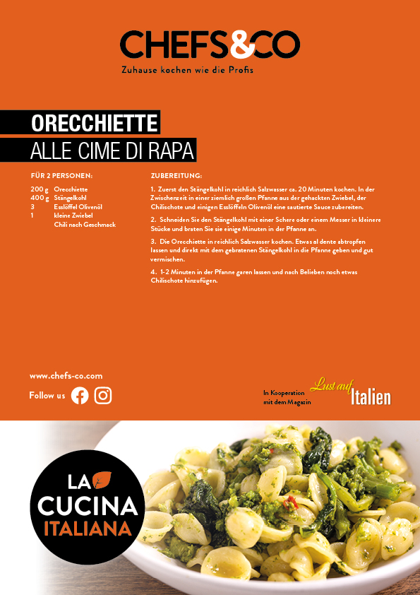 3. Die Orecchiette in reichlich Salzwasser kochen. Etwas al dente abtropfen lassen und direkt mit dem gebratenen Stängelkohl in die Pfanne geben und gut vermischen.