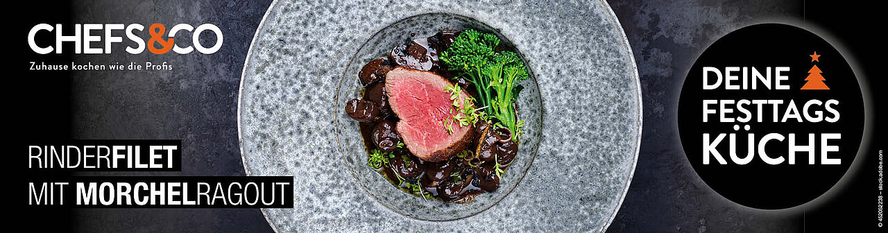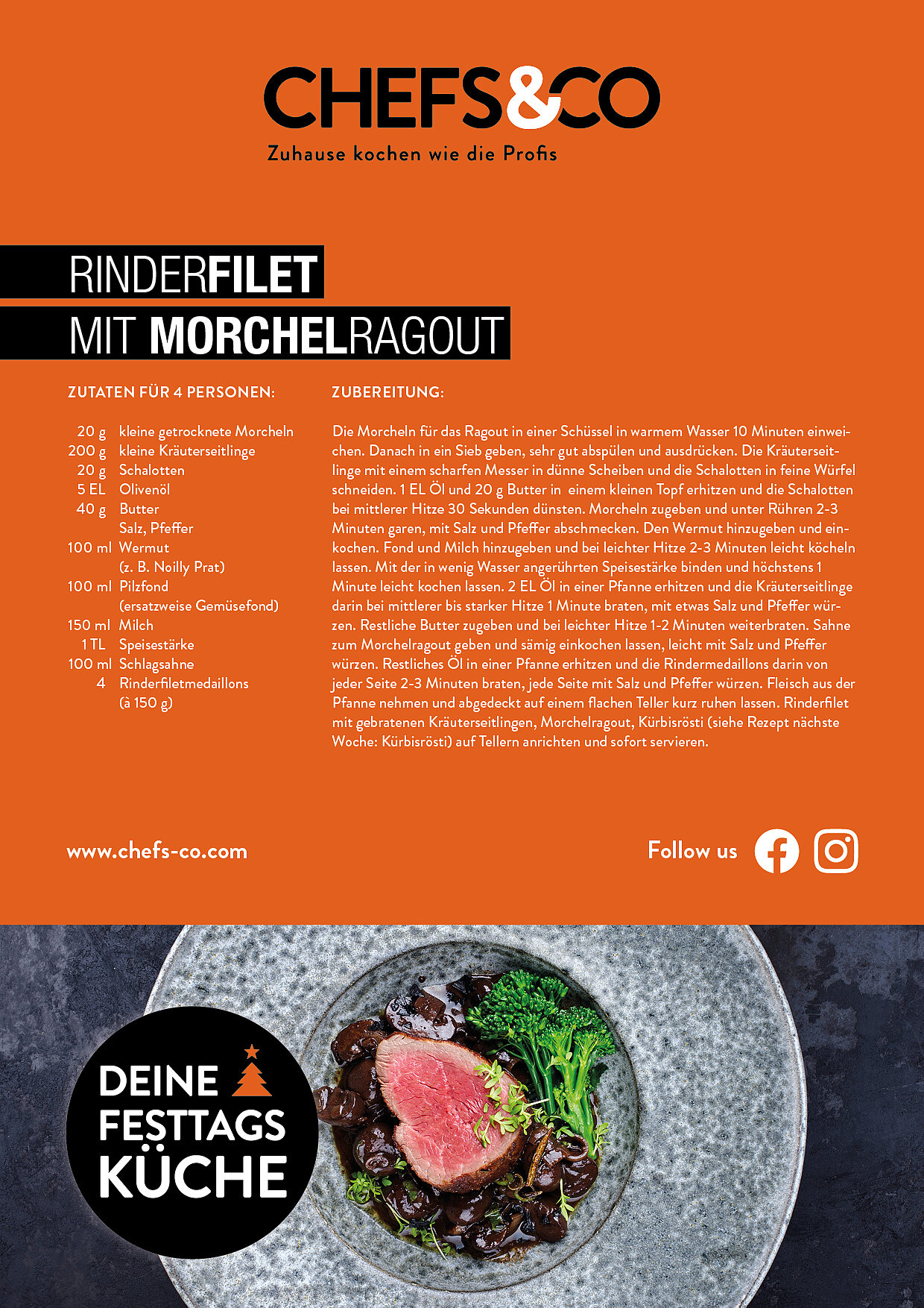 Restliches Öl in einer Pfanne erhitzen und die Rindermedaillons darin von jeder Seite 2-3 Minuten braten, jede Seite mit Salz und Pfeffer würzen. Fleisch aus der Pfanne nehmen und abgedeckt auf einem flachen Teller kurz ruhen lassen. Rinderfilet mit gebratenen Kräuterseitlingen, Morchelragout, Kürbisrösti (siehe Rezept nächste Woche: Kürbisrösti) auf Tellern anrichten und sofort servieren.