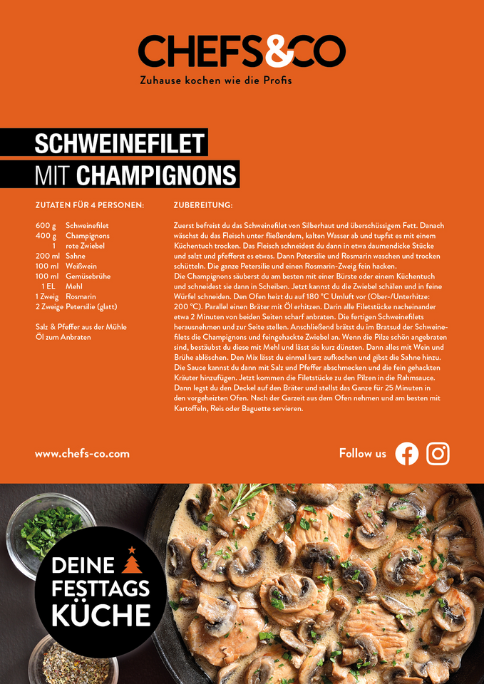 Den Ofen heizt du auf 180 °C Umluft vor (Ober-/Unterhitze: 200 °C). Parallel einen Bräter mit Öl erhitzen. Darin alle Filetstücke nacheinander etwa 2 Minuten von beiden Seiten scharf anbraten. Die fertigen Schweinefilets herausnehmen und zur Seite stellen. Anschließend brätst du im Bratsud der Schweinefilets die Champignons und feingehackte Zwiebel an. Wenn die Pilze schön angebraten sind, bestäubst du diese mit Mehl und lässt sie kurz dünsten. Dann alles mit Wein und Brühe ablöschen. Den Mix lässt du einmal kurz aufkochen und gibst die Sahne hinzu. Die Sauce kannst du dann mit Salz und Pfeffer abschmecken und die fein gehackten Kräuter hinzufügen. Jetzt kommen die Filetstücke zu den Pilzen in die Rahmsauce. Dann legst du den Deckel auf den Bräter und stellst das Ganze für 25 Minuten in den vorgeheizten Ofen. Nach der Garzeit aus dem Ofen nehmen und am besten mit Kartoffeln, Reis oder Baguette servieren.